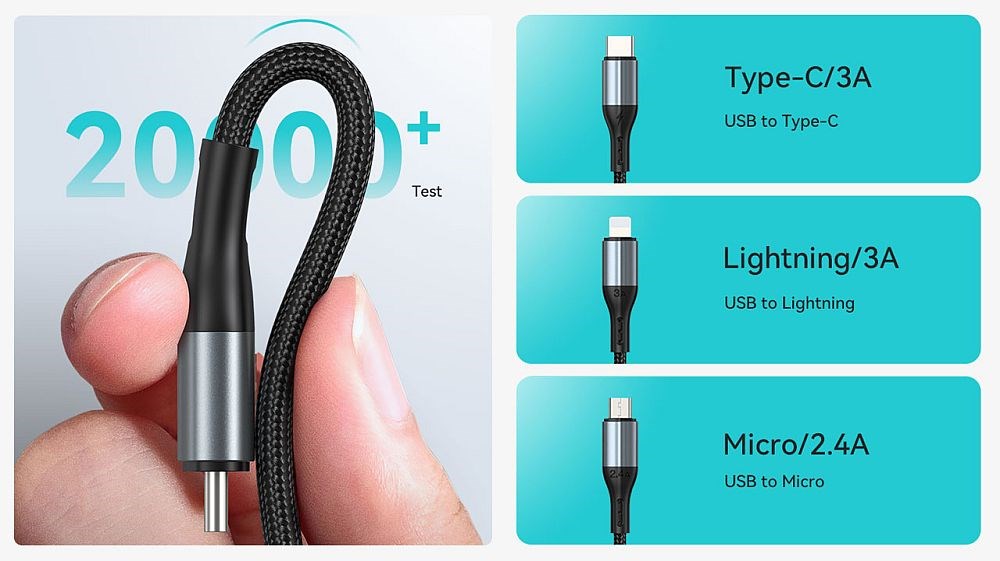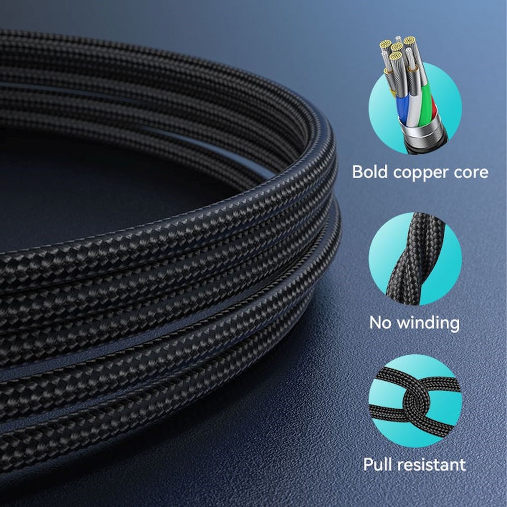 Kabel ima visokokvalitetne vrhunske unutarnje jezgre od na oksidaciju otpornih kositrenih bakrenih žica prekrivene izdržljivim najlonskim pletenim omotačem koji je čvrst i mekan te se odupire svakodnevnom petljanju i lako podnosi zahtjeve svakodnevne upotrebe, što obećava impresivnu dugotrajnost tako da izdrži 20 000 testova savijanja