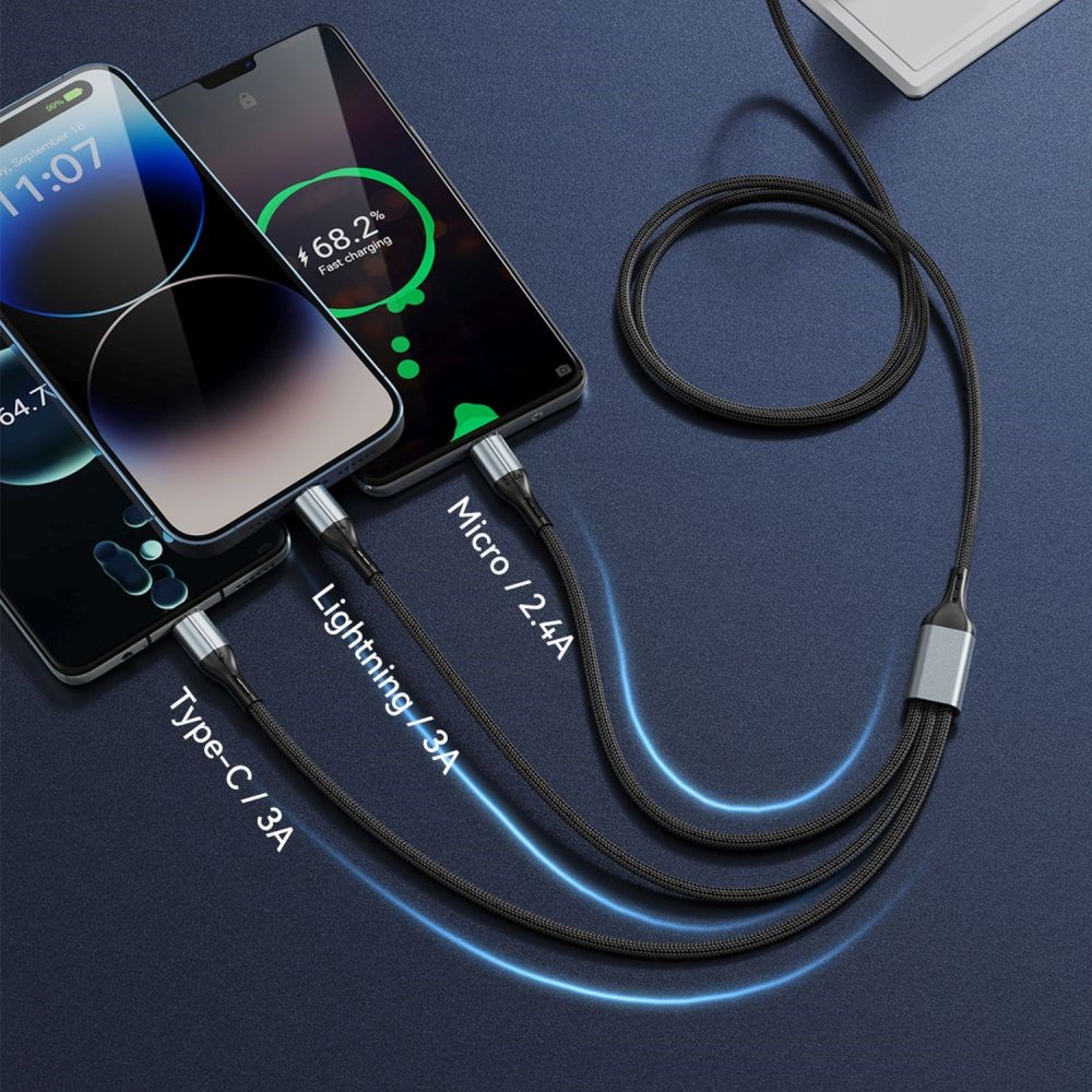 USB-A na Lightning (3A) / na USB-C (3A) / na micro USB (2,4A)