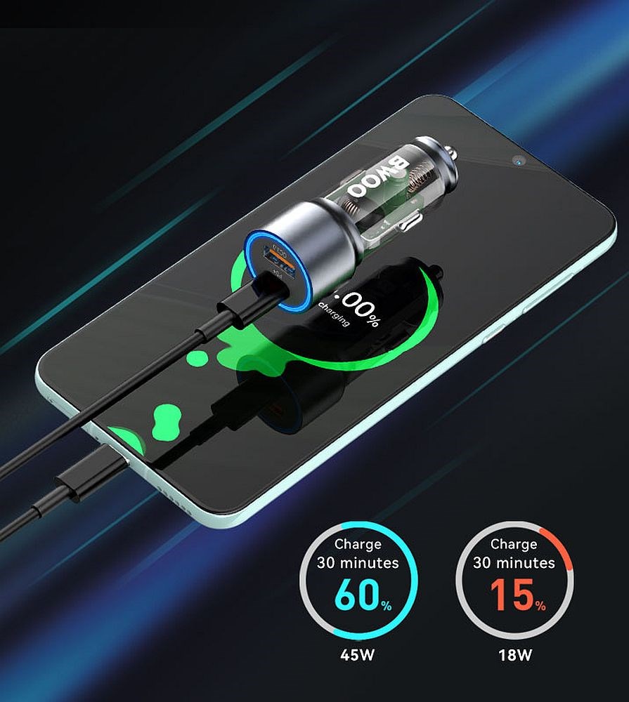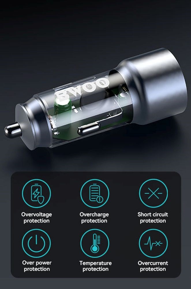Ovaj BWOO 45W USB-C auto punjač isporučuje ukupnu snagu od 38W i podržava PD i QC protokole za brzo punjenje širokog spektra uređaja