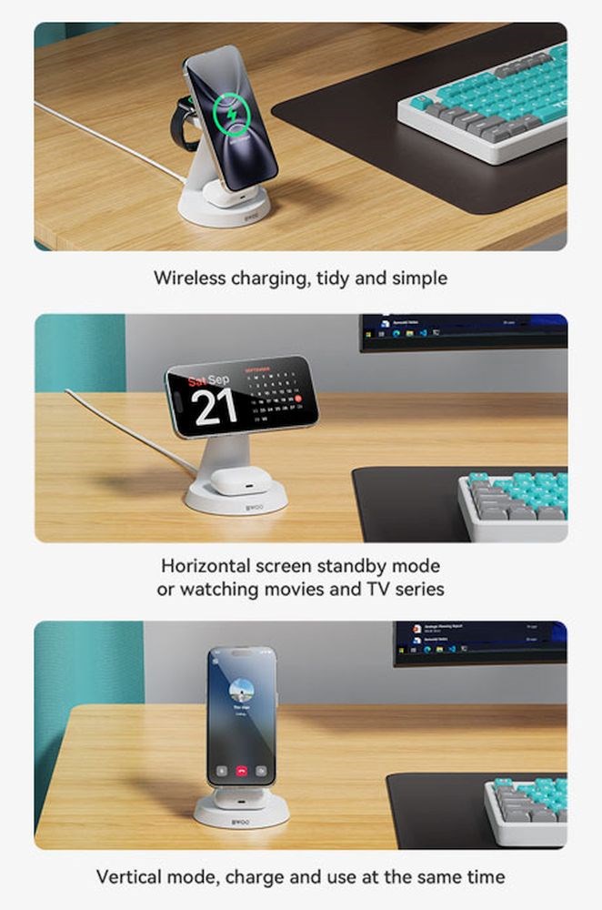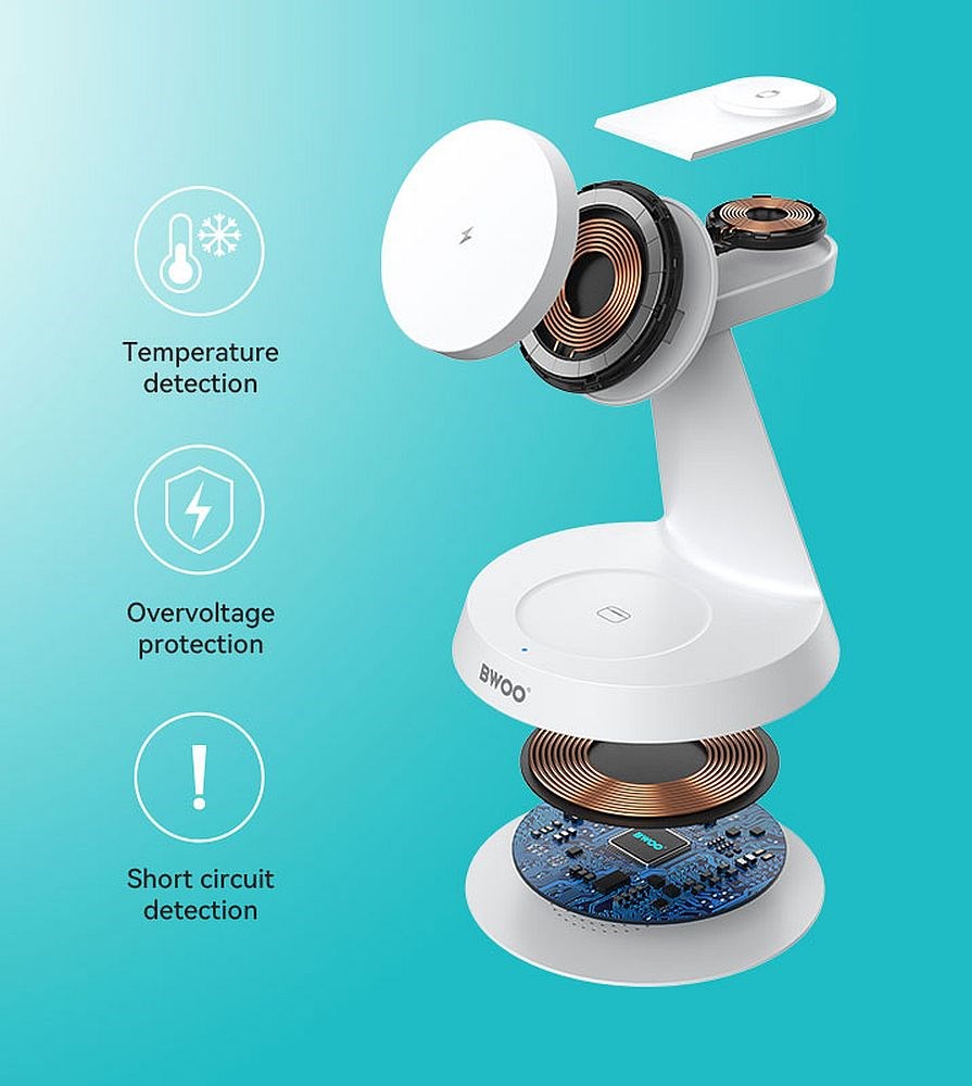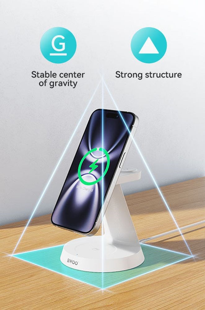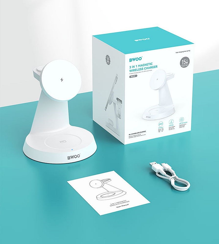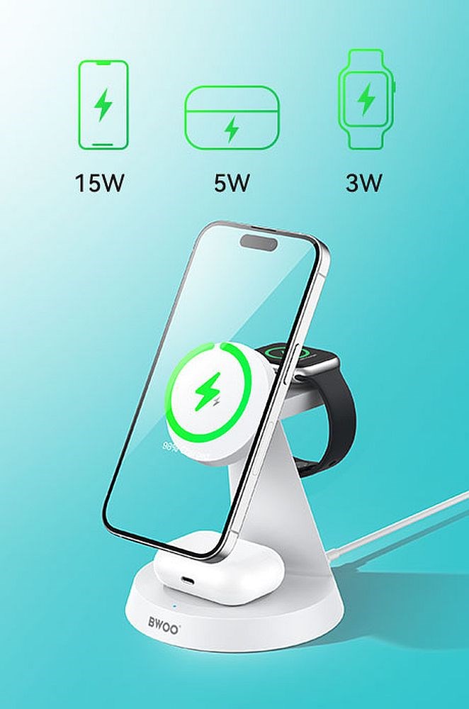 BWOO 3 u 1 magnetski bežični punjač ima tri sučelja za punjenje, što vam omogućuje punjenje telefona, sata i bežičnih slušalica u jednom elegantnom uređaju.