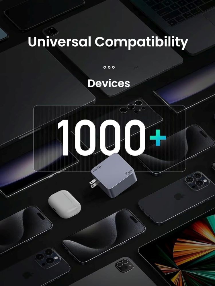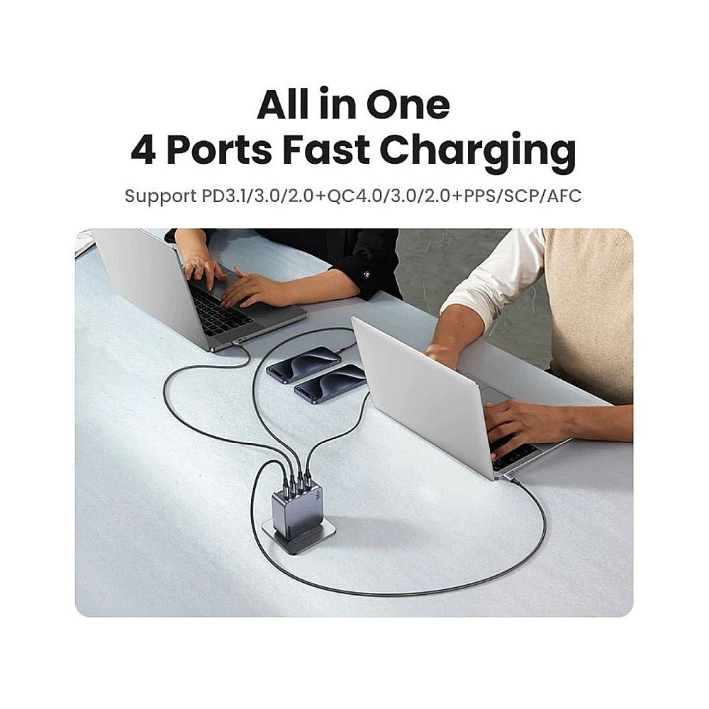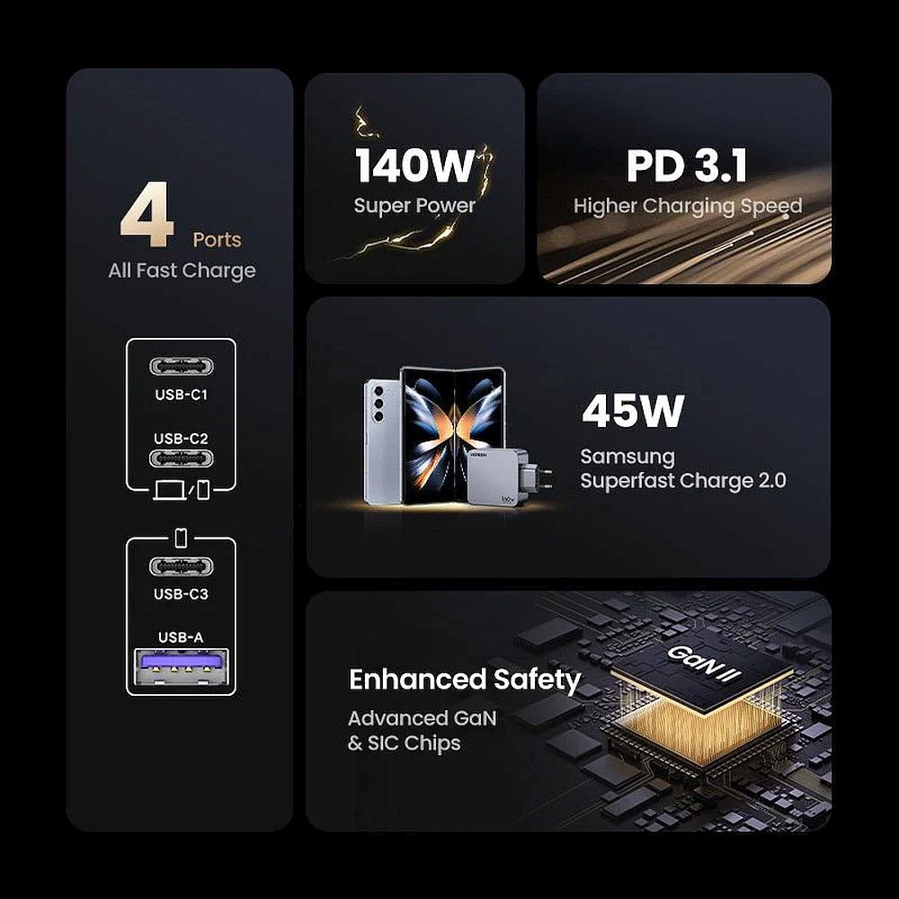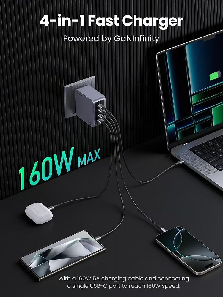 Zahvaljujući GaN tehnologiji i podršci za brzo punjenje Power Delivery i Qualcomm QuickCharge 5, ovaj punjač može podnijeti do 160 W.