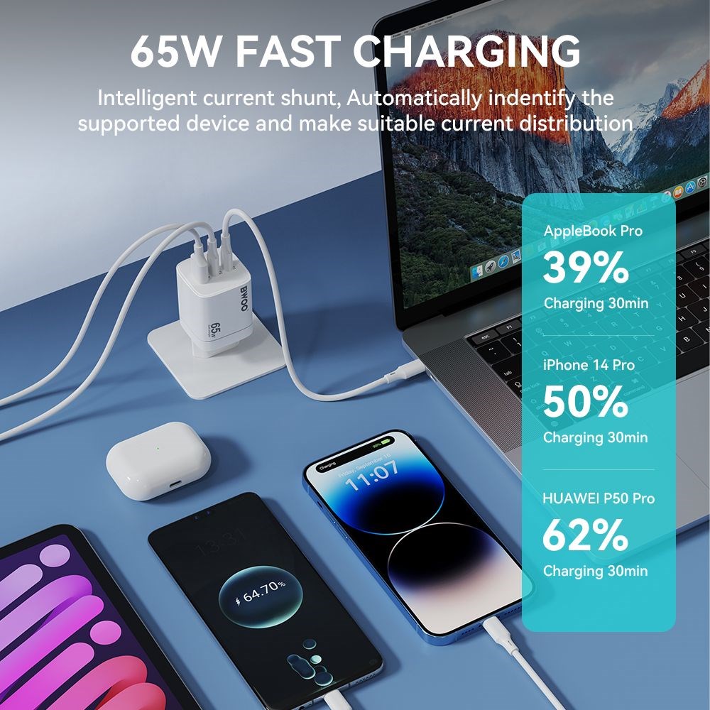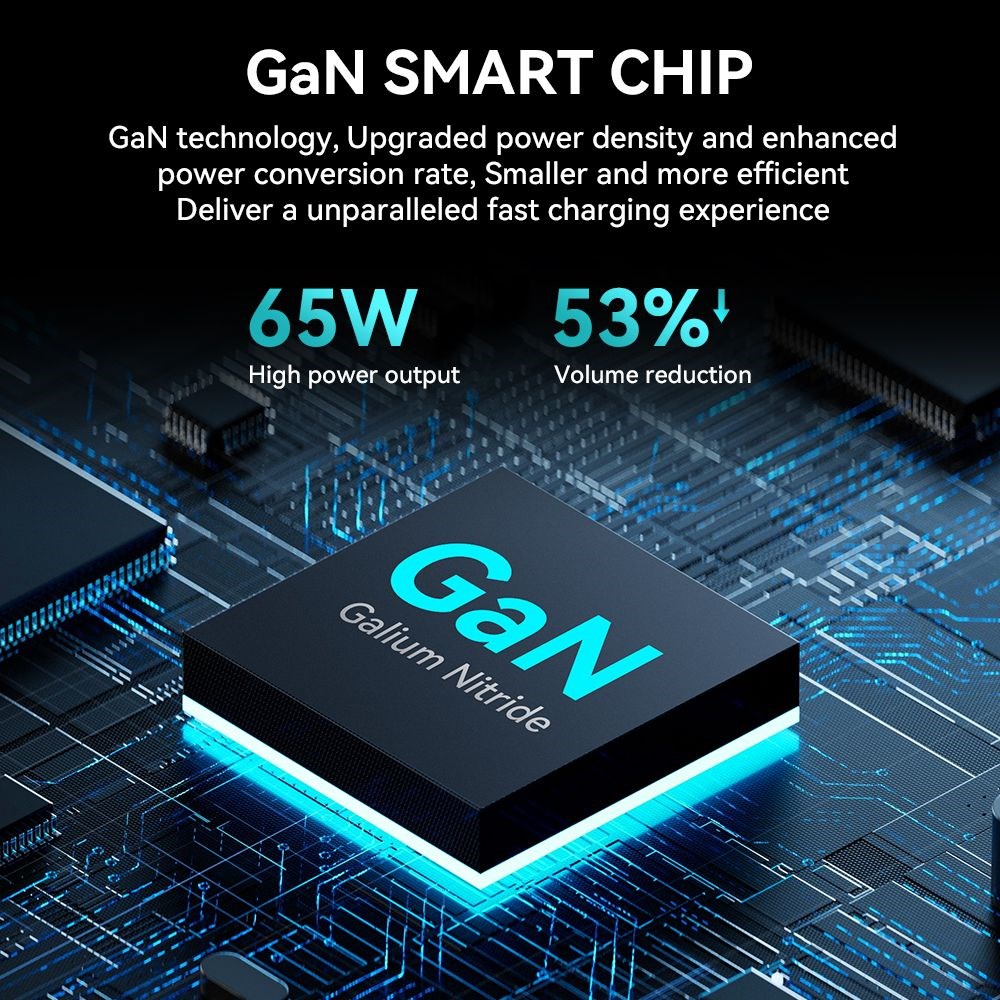 Ugrađeni inteligentni GaN čip znatno povećava gustoću snage i učinkovitost pretvorbe, pružajući efikasnije i brže punjenje, dok poboljšava toplinsku učinkovitost za 13% i smanjuje temperaturu punjenja za 10% u usporedbi s drugim punjačima od 65W.