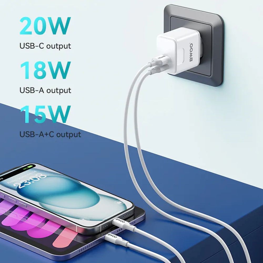 Kućni ili putni punjač koji daje komoditet punjenja svih uređaja koji koriste USB utičnicu tipa Quick Charge 3.0 USB-A s maksimalnih 20 W ili USB Type C (5VDC 3A) za napajanje više uređaja simultano