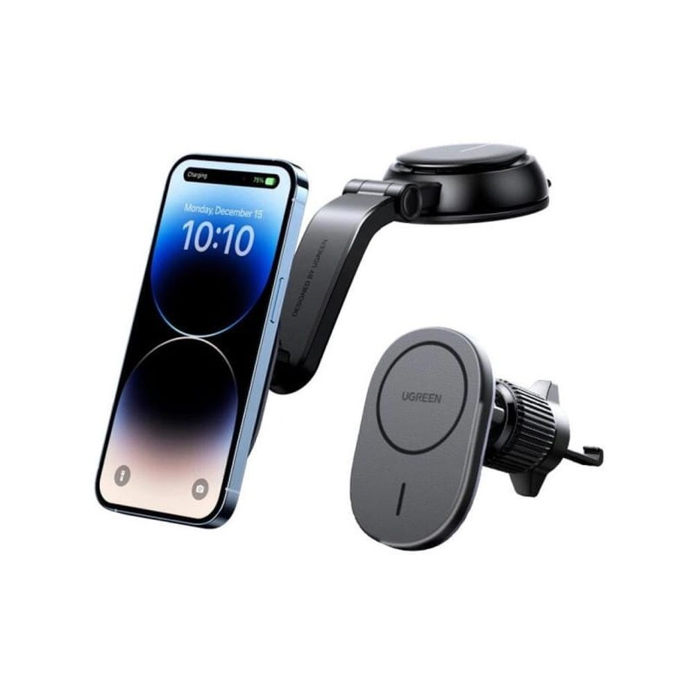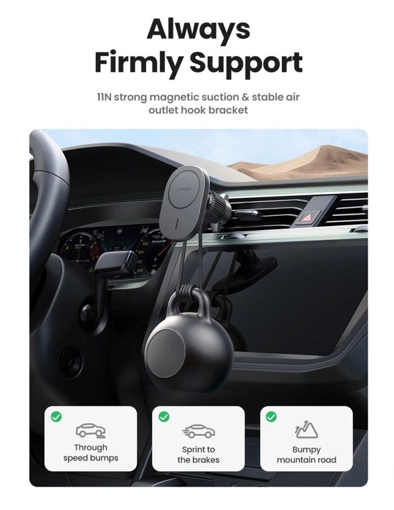 Automobilski držač s ugrađenim MagSafe/Qi bežičnim punjačem je dodatak dizajniran za postavljanje na armaturnu ploču, vjetrobransko staklo ili ventilacijsku rešetku automobila.