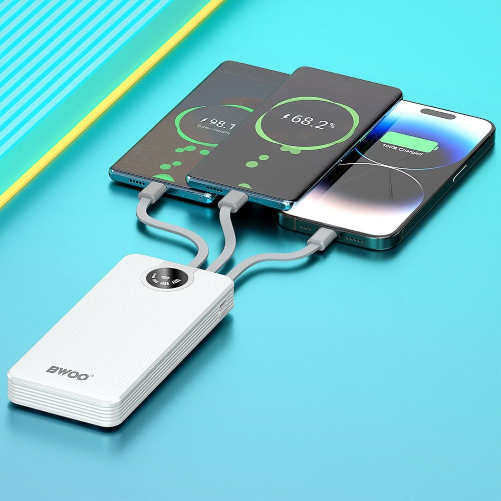 Opremljen s četiri ugrađena višenamjenska odvojiva kabela za punjenje, uključujući Type-C, USB-A, Micro-USB i Lightning kabel, ovaj snažni prijenosni punjač omogućuje vam istovremeno punjenje četiri uređaja – savršeno za putovanja, posao ili dijeljenje energije u pokretu.