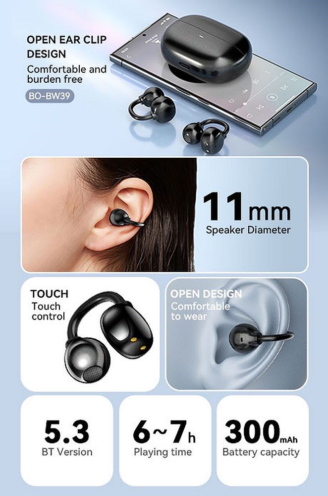 BWOO BO-BW39 bežične stereo slušalice s otvorenim kopčama za uši, dizajnirane da se besprijekorno prilagode vašim ušima, pružaju visokokvalitetan zvuk zahvaljujući visokokvalitetnim senzorima i modernoj Bluetooth 5.3 tehnologiji dometa 15 m