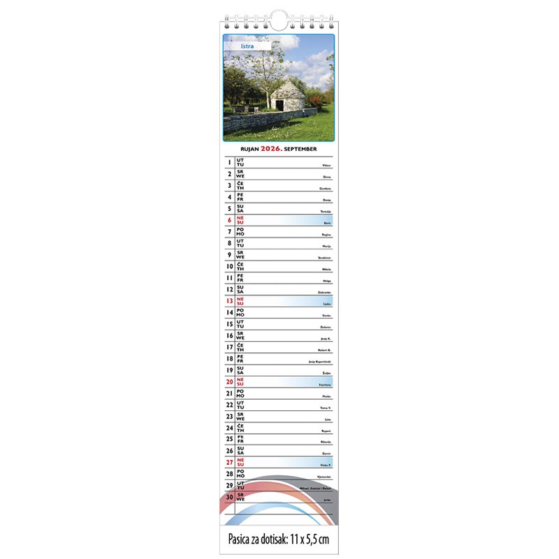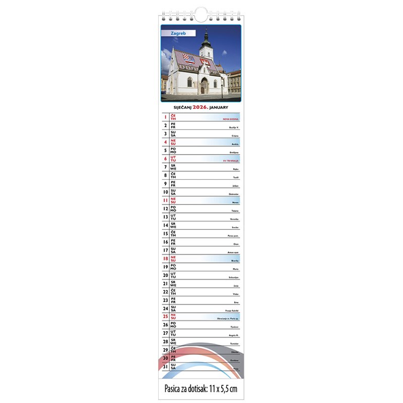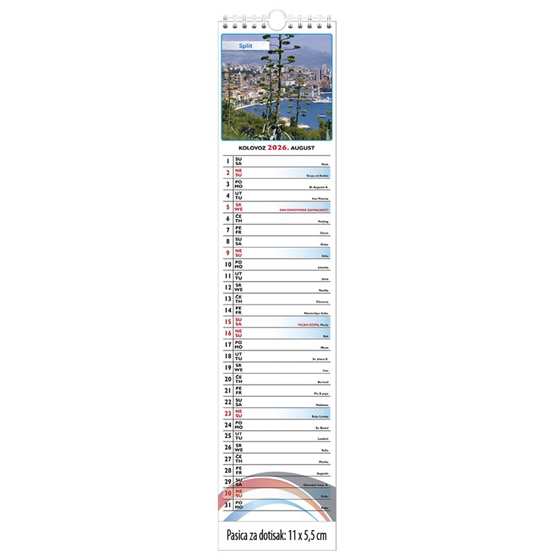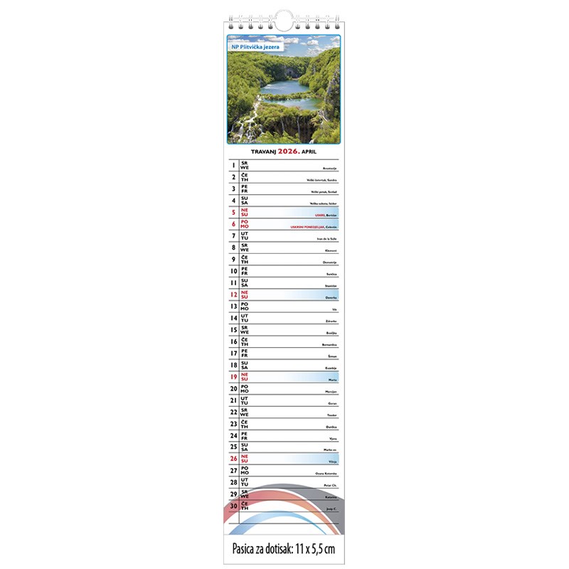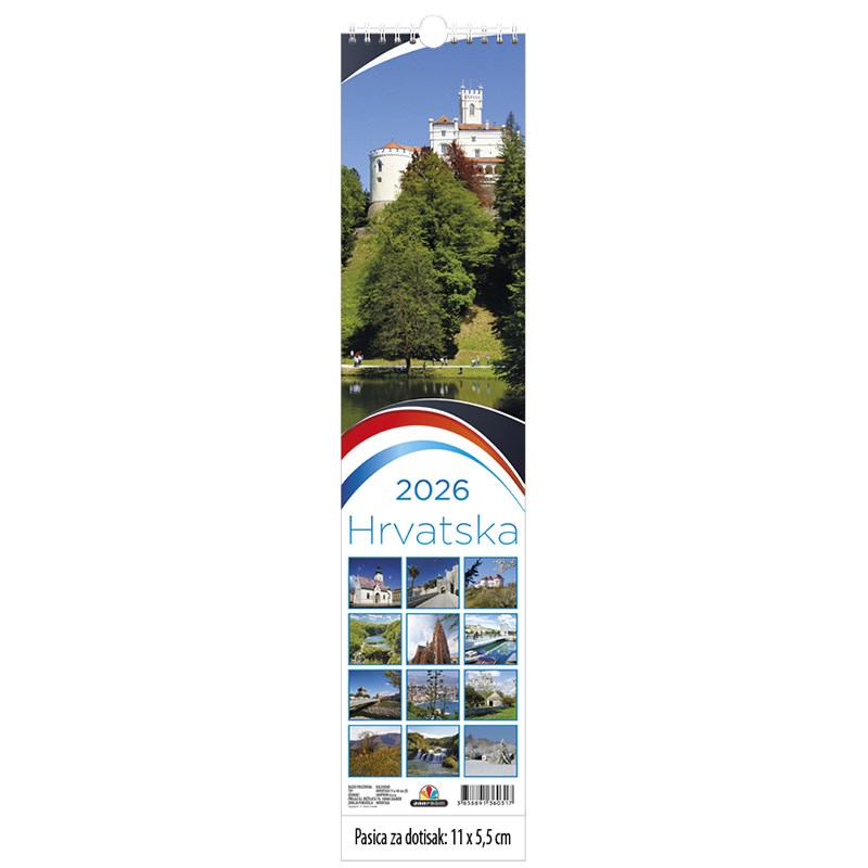 Dugi zidni kalendar s motivom Hrvatske. Dimenzije: 11 x 48 cm