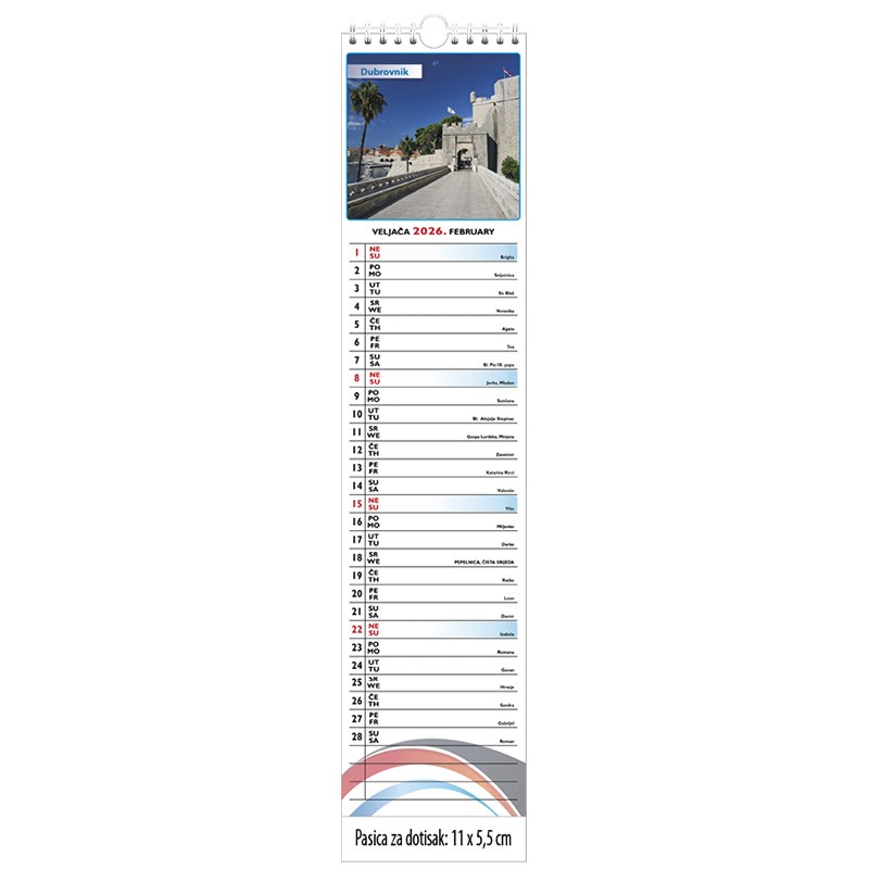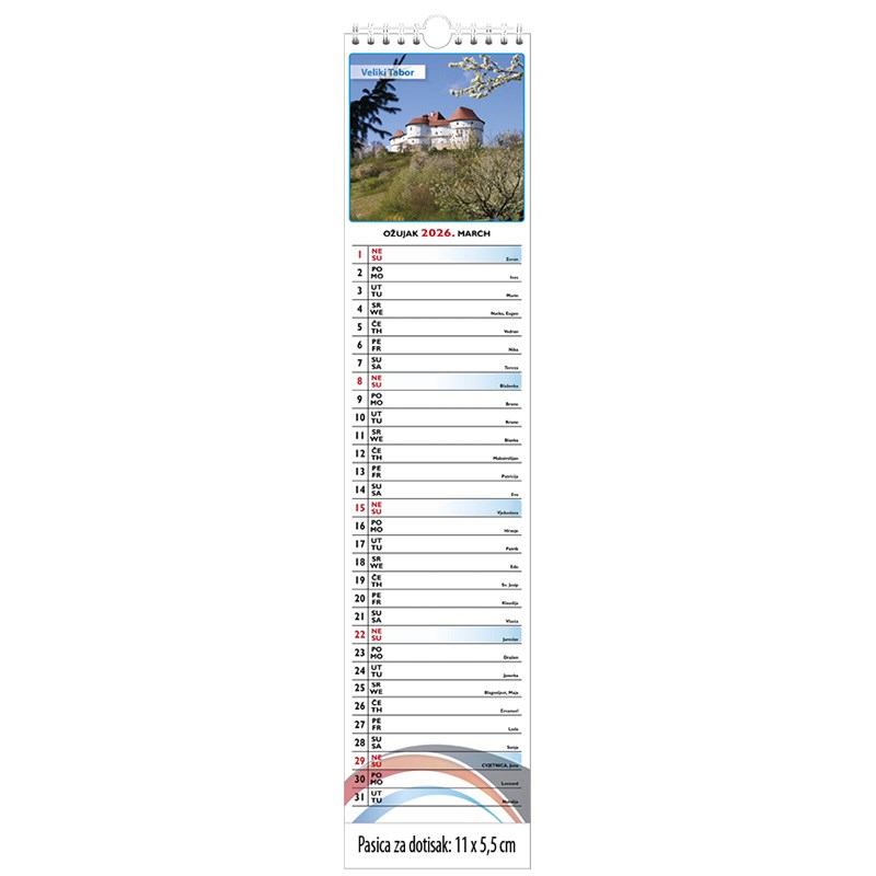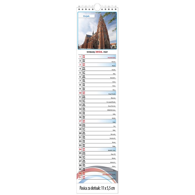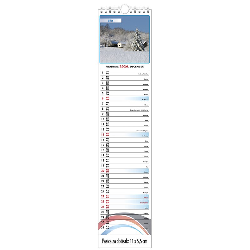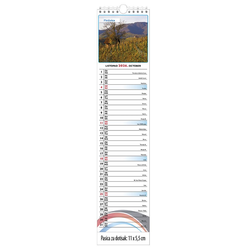 Dugi zidni kalendar s motivom Hrvatske. Dimenzije: 11 x 48 cm