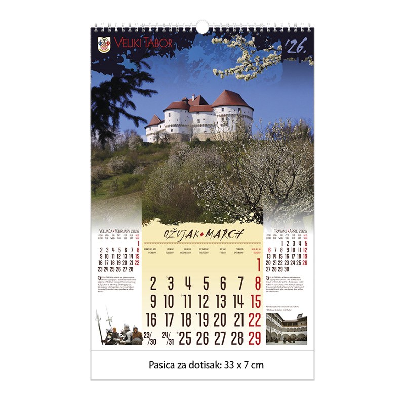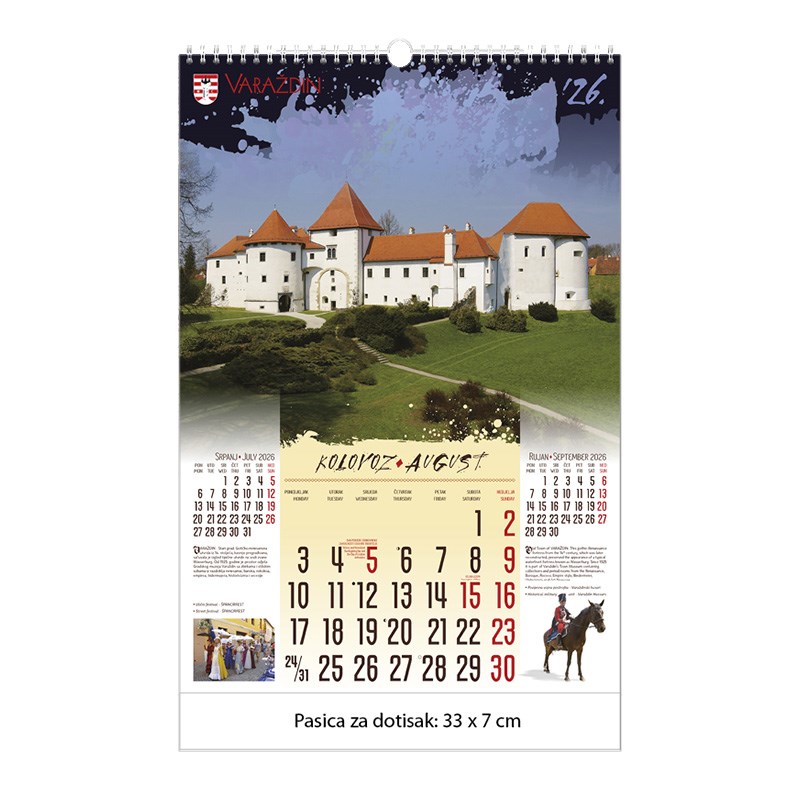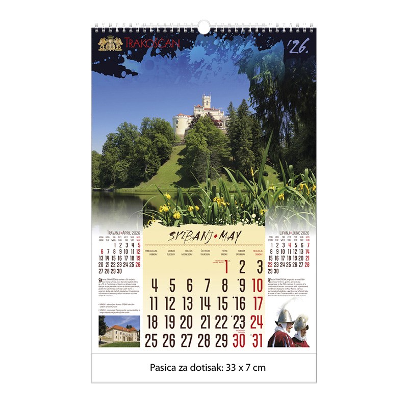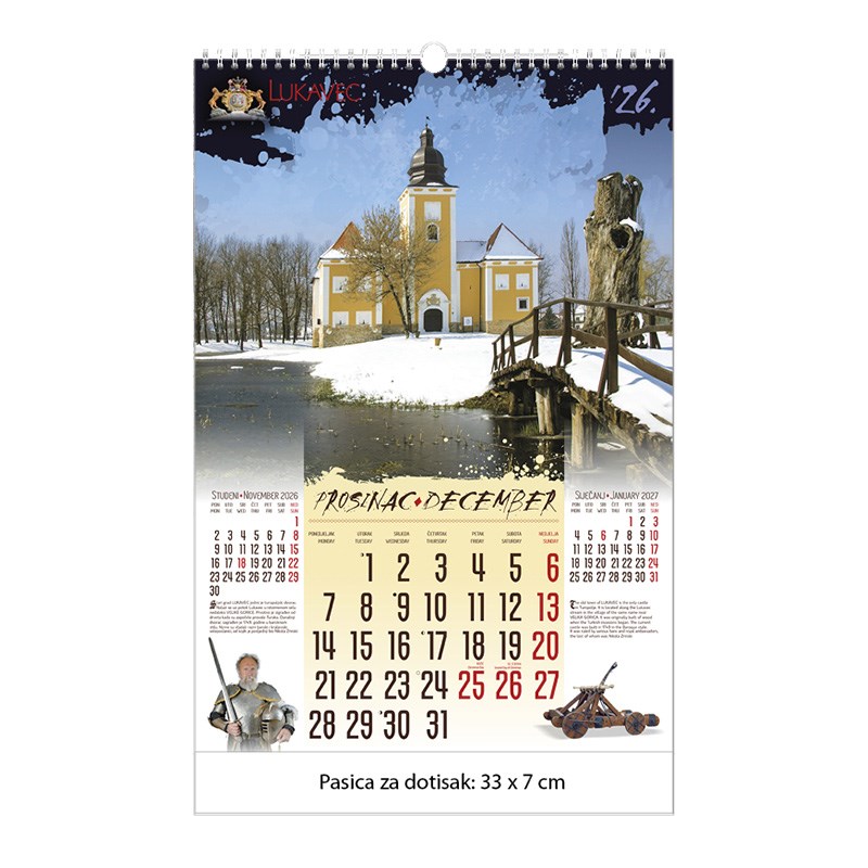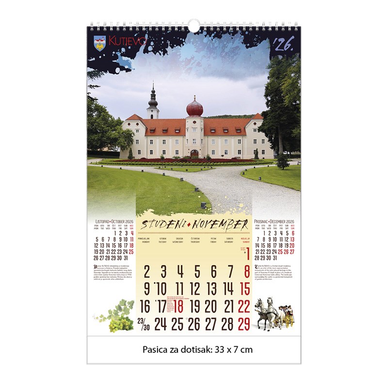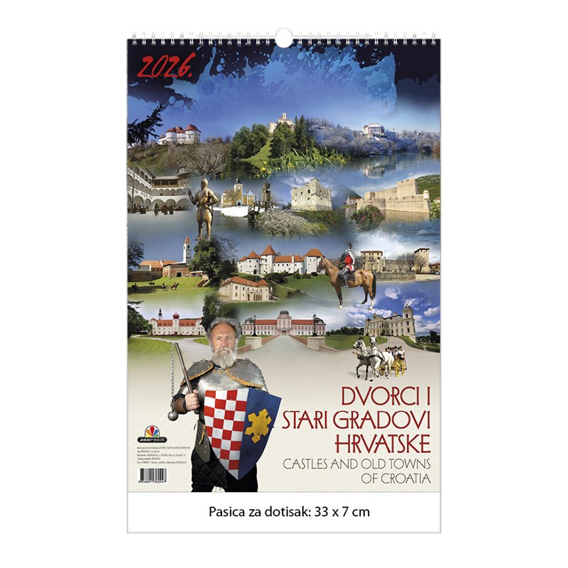Zidni kalendar motivom dvoraca i starih gradova. Dimenzije: 33 x 48 cm Mogućnost dotiska na pasicu na dnu kalendara.