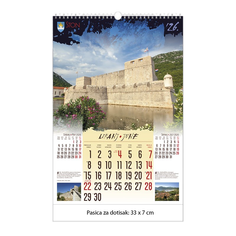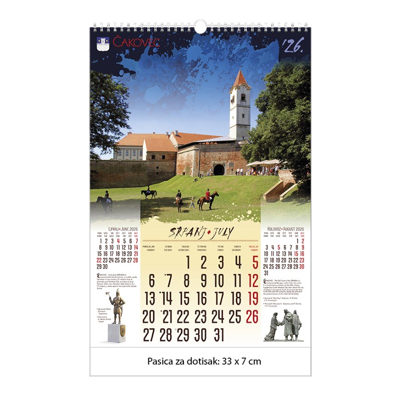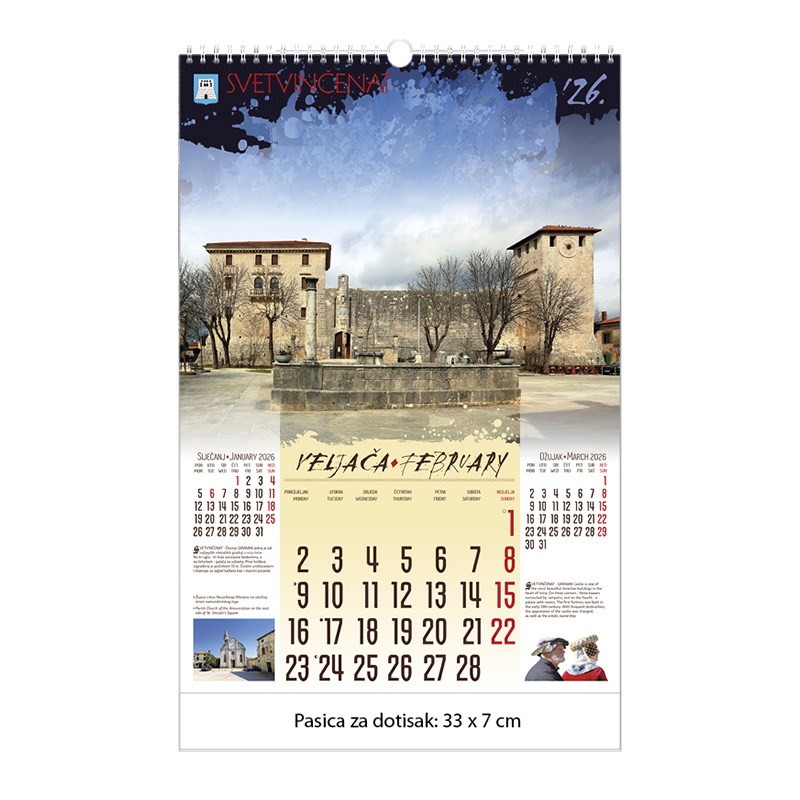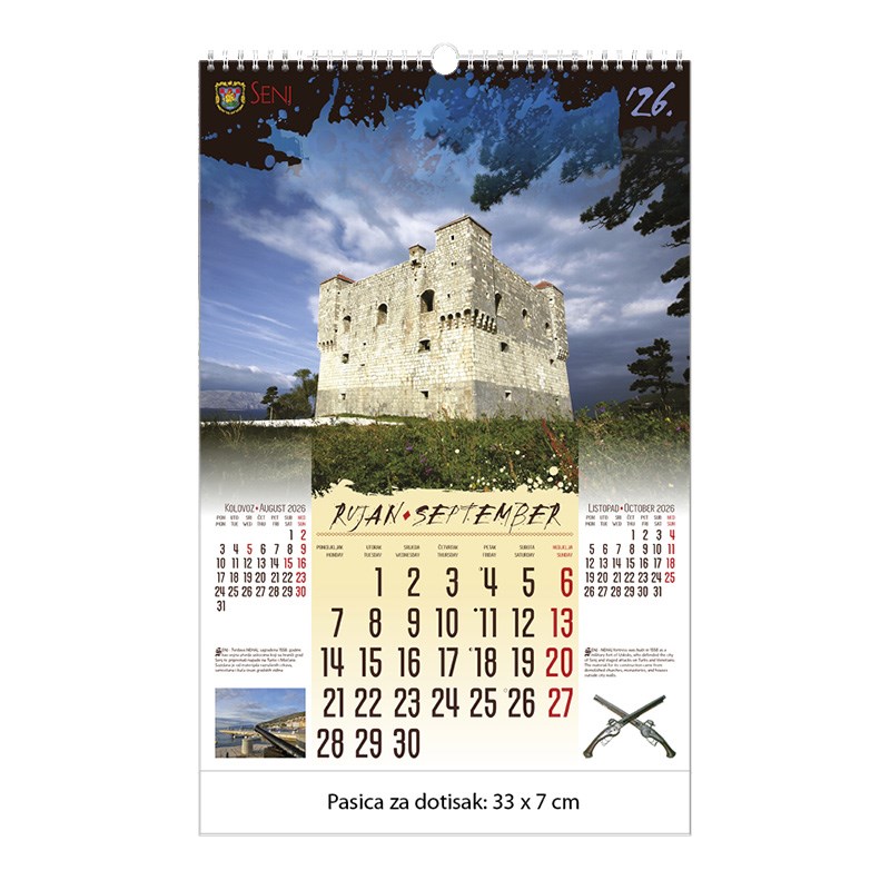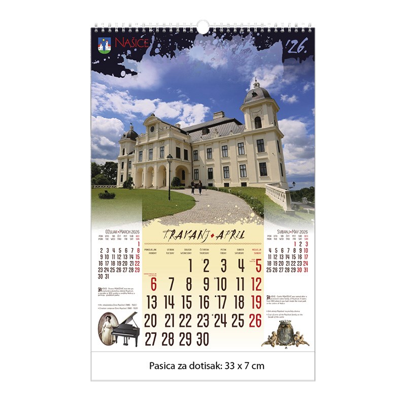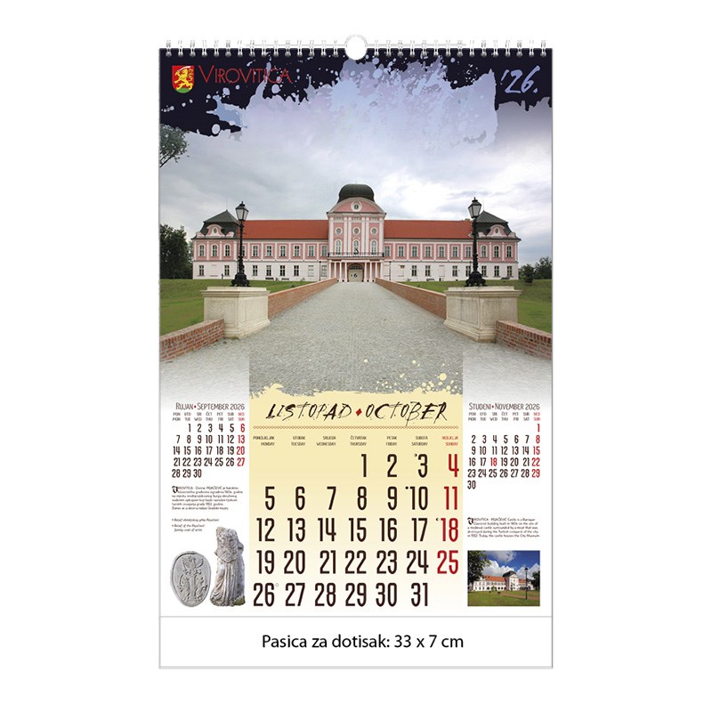 Zidni kalendar motivom dvoraca i starih gradova. Dimenzije: 33 x 48 cm Mogućnost dotiska na pasicu na dnu kalendara.