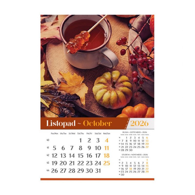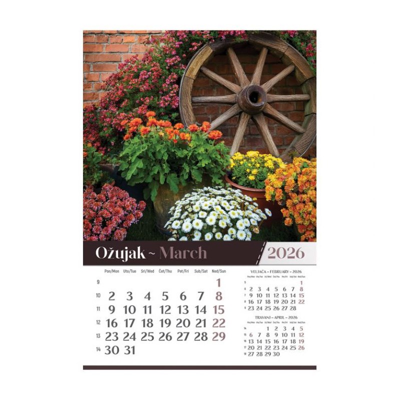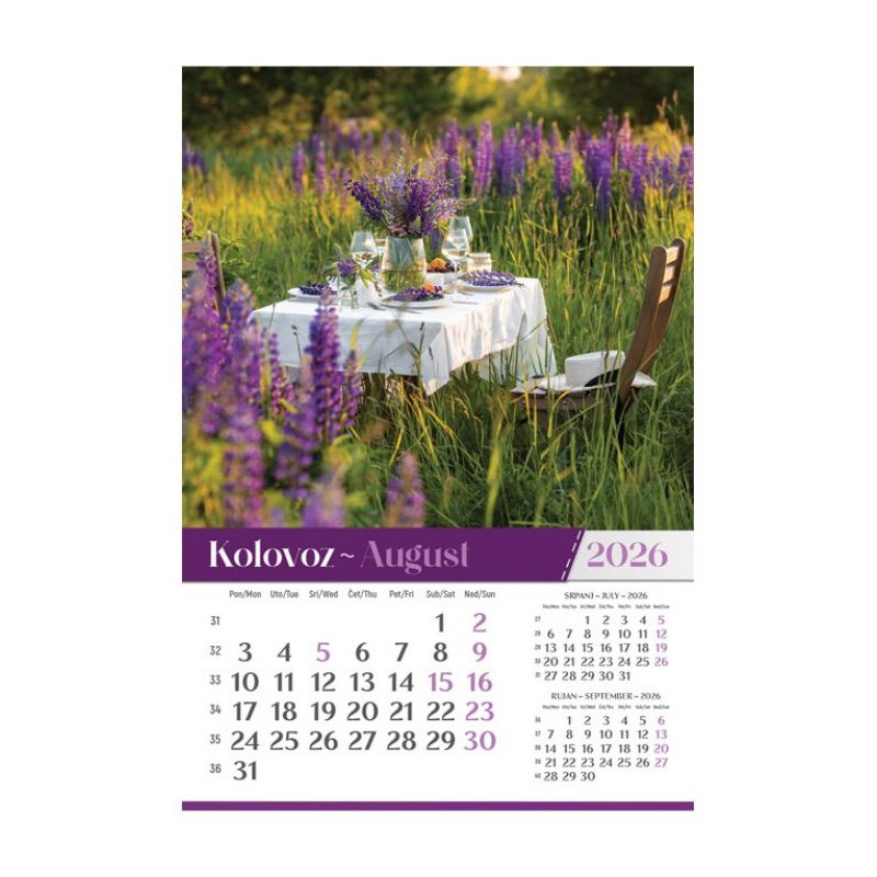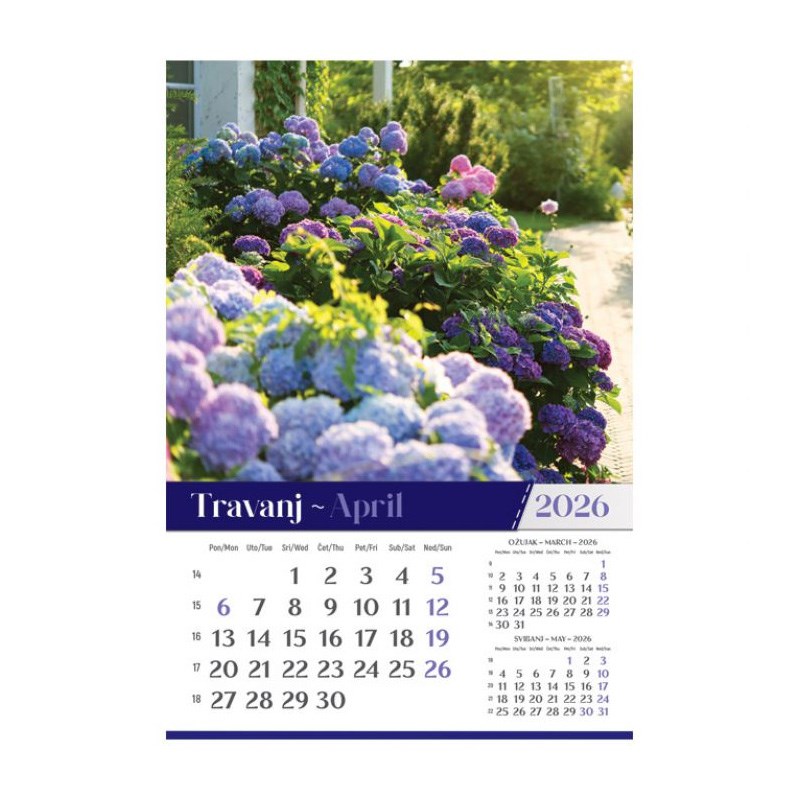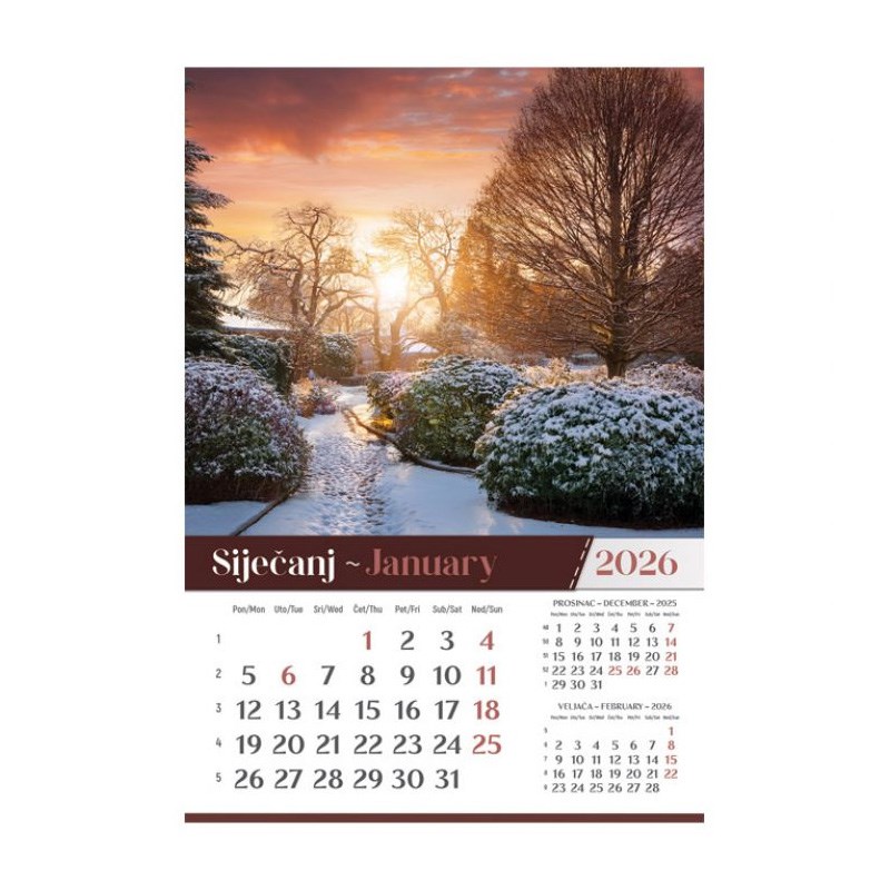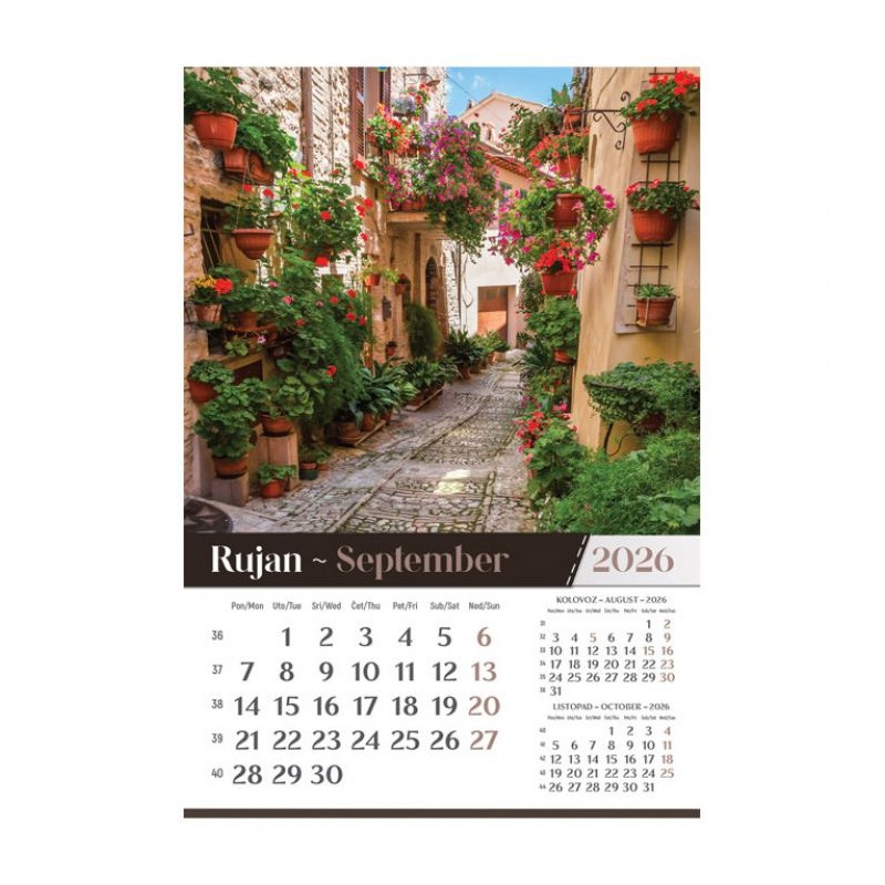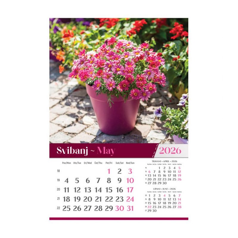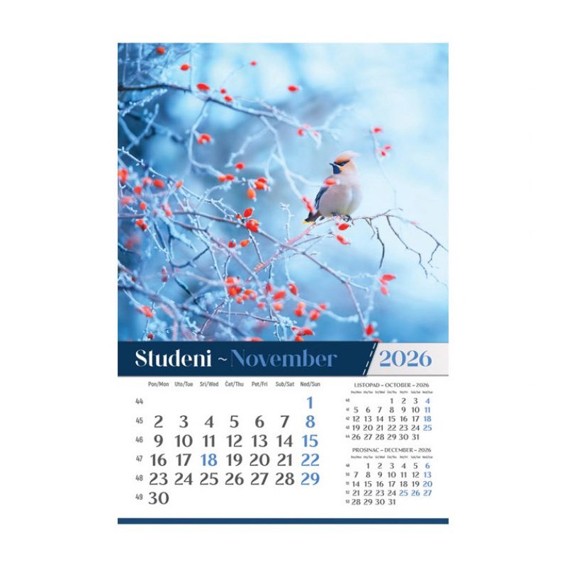 Zidni kalendar od 13 listova sa spiralom; dimenzija: 33x48 cm; pasica za dotisak 6 cm.