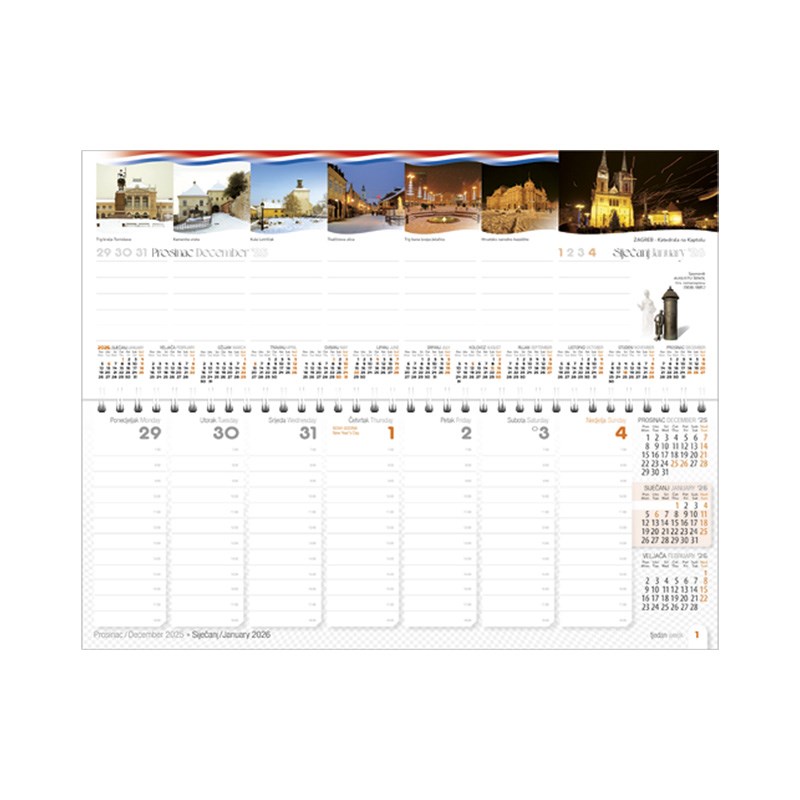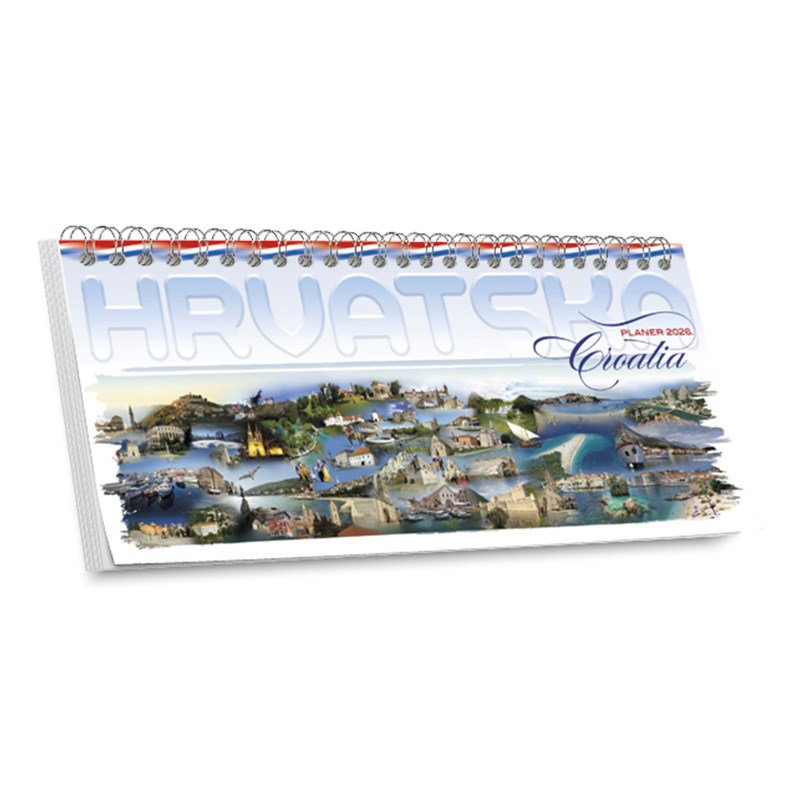Stolni planer s kalendarom i mogućnošću upisivanja podsjetnika. Motiv Hrvatske. Dimenzije: 33 x 14 cm