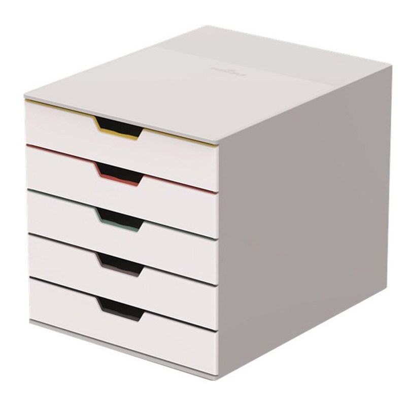 Bijela kutija s 5 ladica u različitim živim bojama unutrašnjosti i rubova. Visoko kvalitetna plastika, glatko i bešumno otvaranje s zaustavljivačem. Protuklizna podloga.