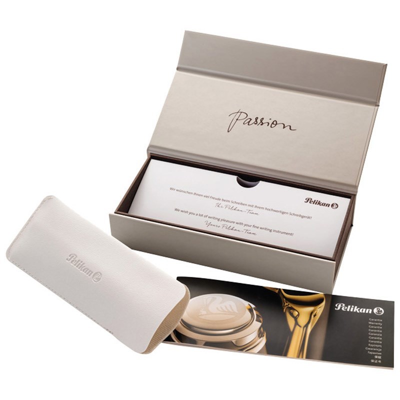 Pelikan Souverän ® K400 kemijska olovka s tijelom izrađenim od visokokvalitetne smole brušene dijamantom i 24-karatnim pozlatom. Prepoznatljivo prugasto tijelo izrađuje se prema recepturi razvijenoj posebno za Pelikan, od pamučnog materijala u u više koraka izrađuje prugasti komad materijala koji se savija, brusi i potom dijamantom reže po konturi. Pozlaćeni prstenovi na gornjem i donjem dijelu postavljeni su s najvećom preciznošću, stvarajući gotovo besprijekoran prijelaz između materijala prije nego što se pisaći instrument polira do visokog sjaja. Blago elastična, tipična Pelikanova kopča za kljun daje ovom visokokvalitetnom pisaćem instrumentu nepogrešiv dizajn.