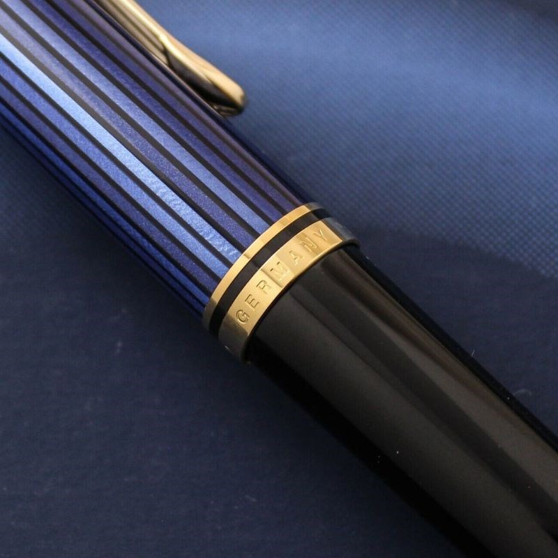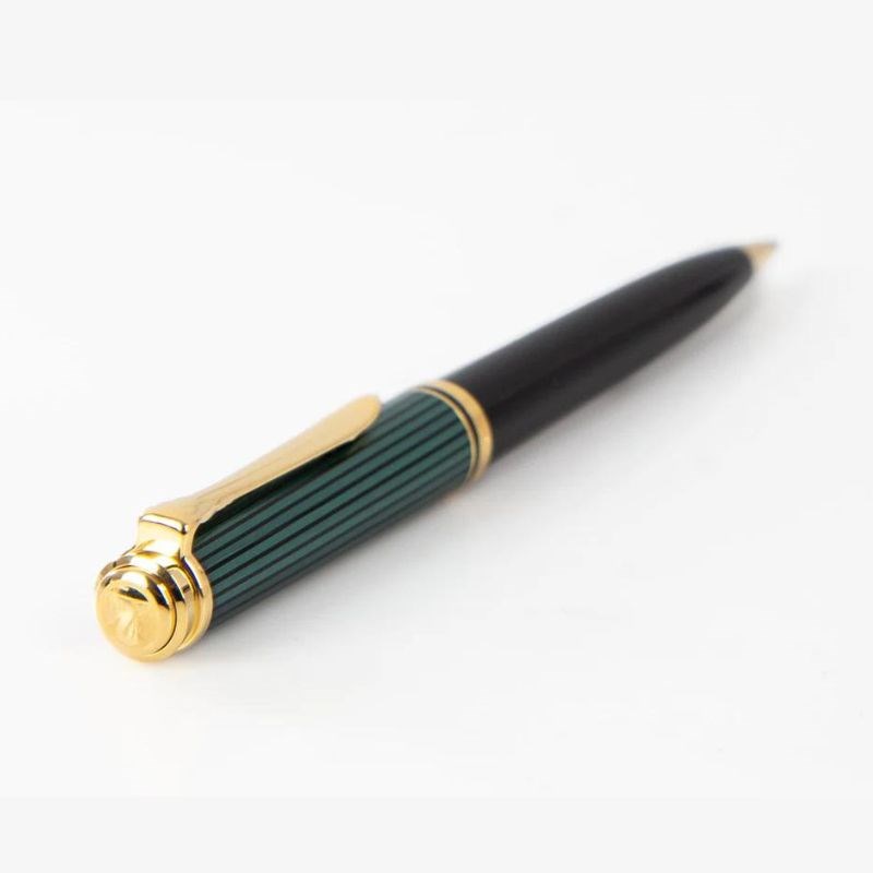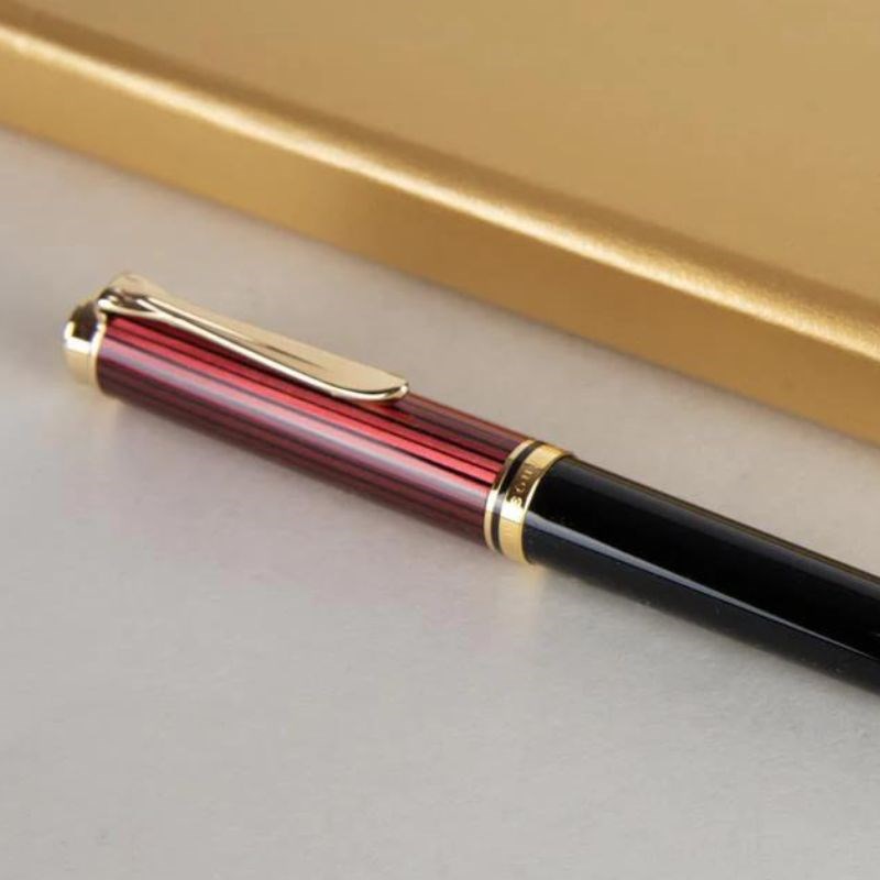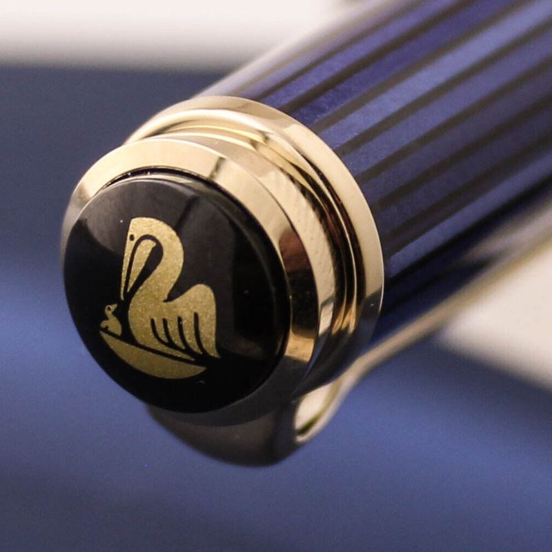 Elegantna Pelikan kemijska olovka Souverän® K800 je klasik iz Pelikana. Izrađena od visokokvalitetne smole, površina brušena dijamantom, klipsa i dekorativni prsteni pozlaćeni 24-karatnim zlatom. Izrada prepoznatljivog prugastog topa je složena, jer prema receptu razvijenom posebno za Pelikan, od pamučnog materijala u mnogo koraka izrađuje prugasti komad materijala koji se savija, brusi i zatim dijamantom reže po konturi. Paladinirani prstenovi na gornjem i donjem dijelu postavljeni su s najvećom preciznošću, stvarajući gotovo besprijekoran prijelaz između materijala prije nego što se pisaći instrument polira do visokog sjaja. Blago elastična, tipična Pelikanova kopča za kljun daje ovom visokokvalitetnom pisaćem instrumentu nepogrešiv dizajn. Kemijska olovka K800 opremljena je velikim uloškom u crnoj boji.
