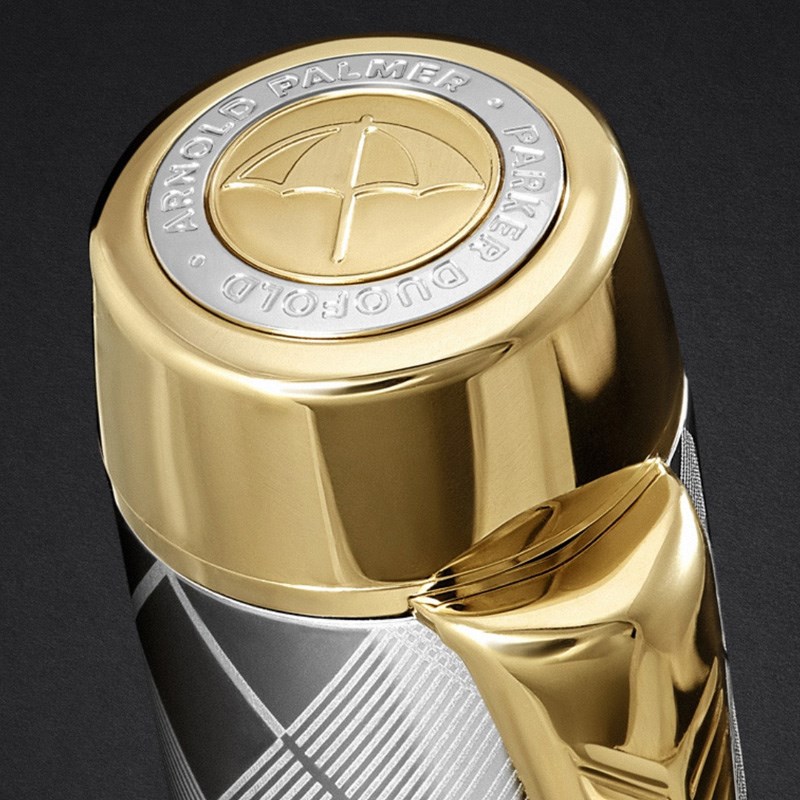 Sofisticirano nalivpero s graduiranim tamnocrvenim lakiranim tijelom, kućištem od brušenog svijetlozlatnog finiša i poliranim čepom od nehrđajućeg čelika s dvobojnim graviranjem. Dvobojni vrh pera od 18-karatnog punog zlata zamršeno je ukrašen klasičnim, laserski ugraviranim Argyle uzorkom križnog šrafiranja i legendarnim potpisom Arnolda Palmera.