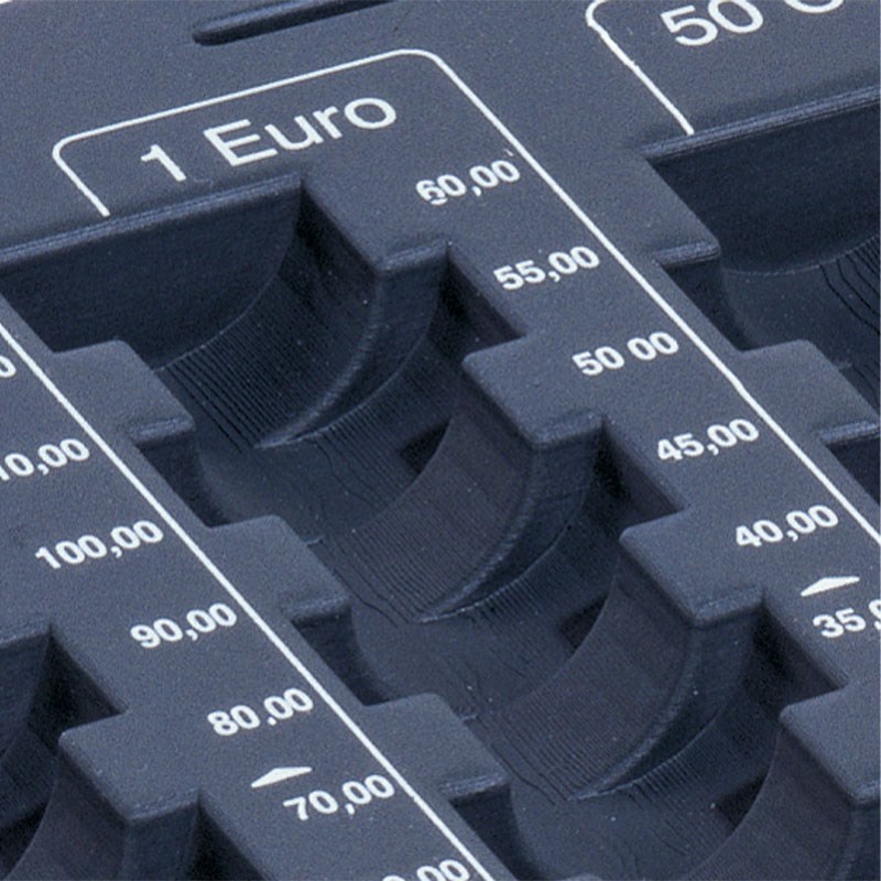 Umetak za ladicu za sortiranje euro novca s 8 pretinaca za slaganje za kovanica u centima i eurima, i pretincem za privremeno skladištenje novčanica. Kapacitet: 233,90 €