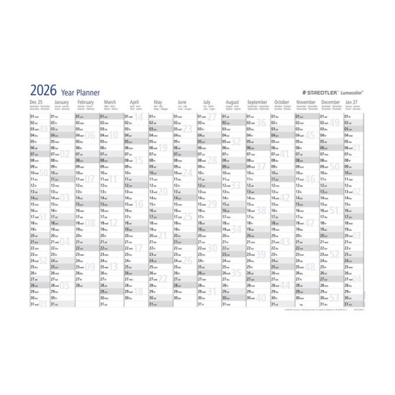 Zidni godišnji planer (kalendar) na piši/briši principu za 2026. godinu. Otisnuti dani po mjesecima s označenim internacionalnim blagdanima. Upis bilješki whiteboard flomasterima.