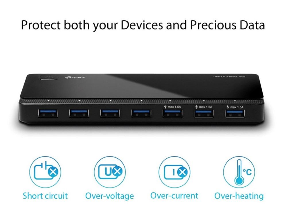 Ima sofisticirani dizajn sklopa s višestrukim zaštitama za vaše uređaje od pregrijavanja, prekomjerne struje, prenapona i kratkog spoja. Ugrađena prenaponska zaštita štiti i vaše uređaje i podatke tijekom prijenosa podataka. Podržava USB priključke s mogućnošću vruće zamjene (hot swapping), koji se mogu sigurno spajati i odspajati dok je računalo uključeno i radi.