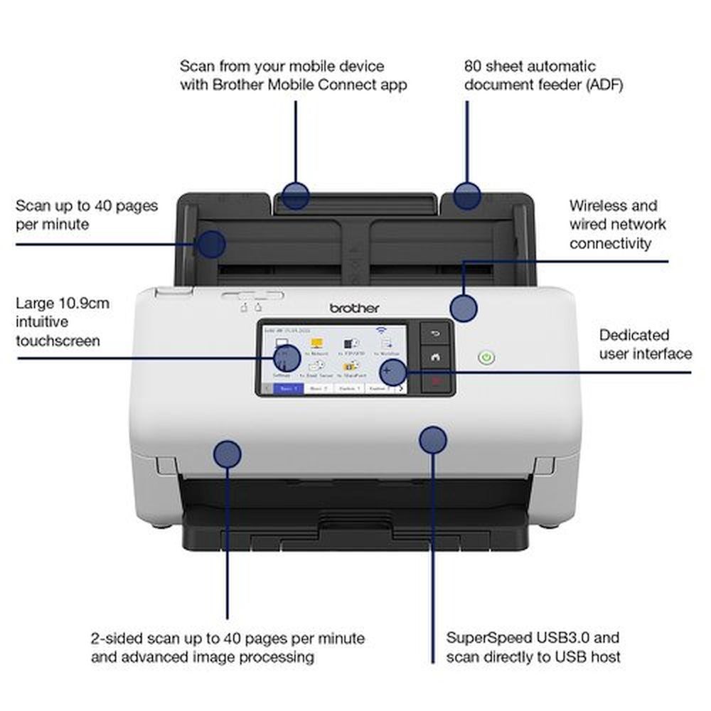 A4 uredski dokument skener s obostranim skeniranjem 40 str/min i ADF-om od 80 listova miješanih dokumenata. Kompatibilan je s raznim vrstama dokumenata, upravljačkih programa i operativnih sustava. Uređaj obradi 40 str/min i do 6.000 listova dnevno .