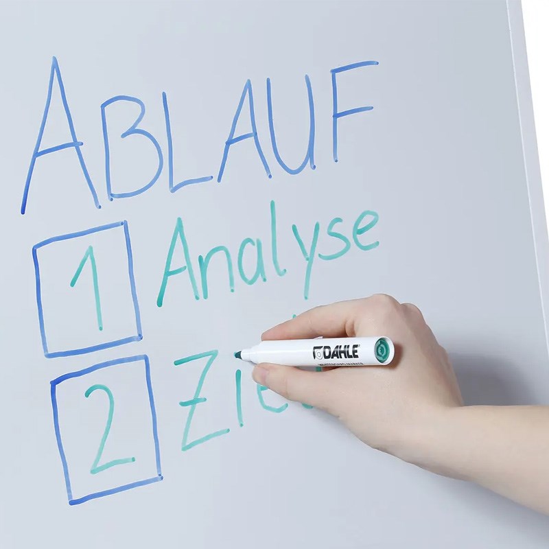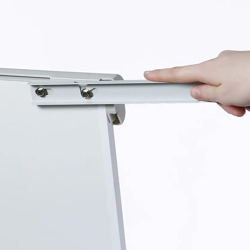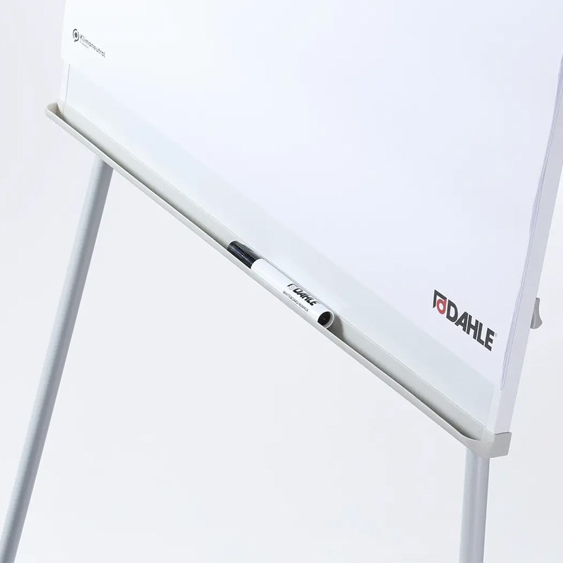 Magnetna bijela ploča 68x92 cm za pisanje whiteboard markerima, korištenje magneta i držanje flipchart blokova. Tri podesive metalne noge, ladica za pribor. Metalni pomični klinovi sa steznim poklopcem za držanje blokova, jednostavno podešavanje prema razmaku rupa na bloku. Dvije bočne sklopive ruke za držanje plakata.