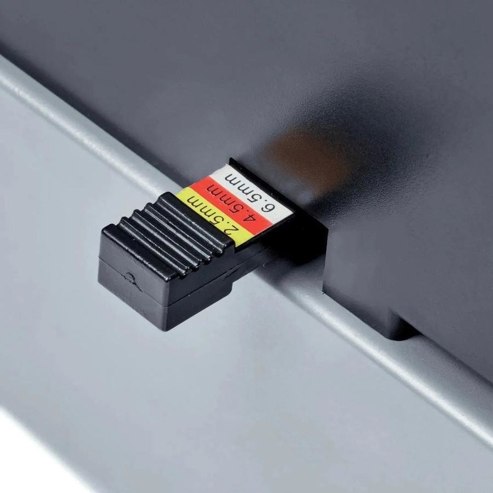 Jednostavan je za korištenje, sa velikim kapacitetom ladice za otpad, ima mogućnost isključivanja svih noževa, regulaciju dubine bušenja (od ruba papira) te podešavanje lijeve margine.