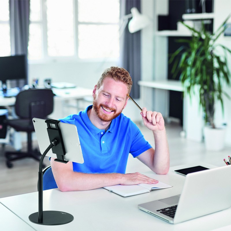 Stolni i podni stalak s držačem za tablet i mobitel, s fleksibilnom rukom i kugličnim zglobom. Prikladno za sve mobilne telefone i tablete, kao i za iPad i iPhone od 4,7-13'' do 800g. Može se podesiti pod bilo kojim kutom rotacijom od 360˚. Neograničena fleksibilnost: ovisno o primjeni , stezaljka se može montirati na stolni ili podni stalak i tako nudi beskrajne mogućnosti primjene. Pomoću teleskopske šipke stalak se može prilagoditi na bilo koju visinu do 1,69 m. Neklizajući jastučići u stezaljci drže tablet ili mobitel stabilnim i dodatno štite od ogrebotina. Upravljanje kabelom kroz integrirani izlaz za kabel u stezaljci. Sklopivi na dužinu 70 cm, te s prikladnom torbicom za nošenje.