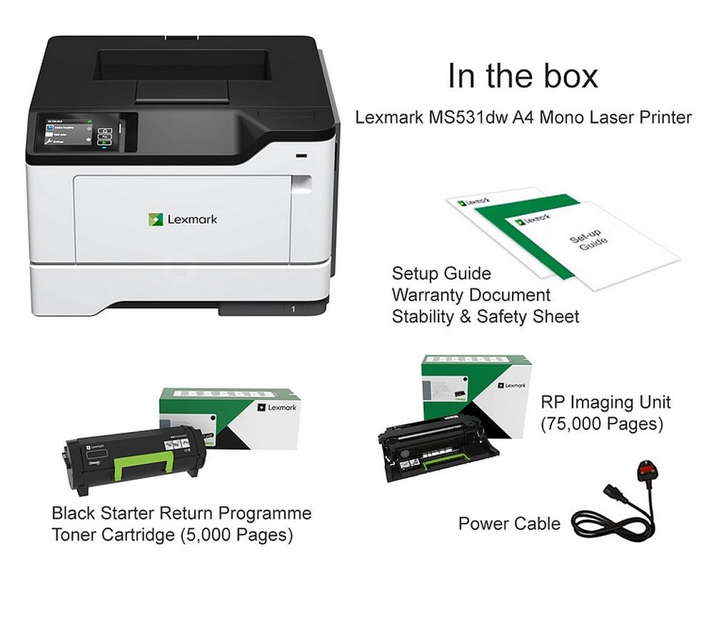 Laserski pisač MS531dw ima mogućnost obostranog ispisivanja, mrežno i bežično povezivanje, procesor s više jezgri brzine 1 GHz, 512 MB standardne memorije i standardni ulazni kapacitet od 350 listova te ispisuje brzinom do 44 stranice u minuti uz prvu stranicu za samo 5,9 sekunde