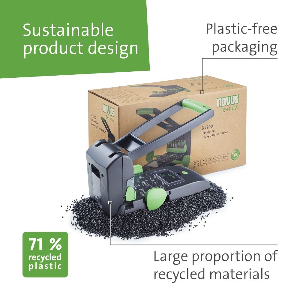 Snažna 2-u-1 blok bušilica za bušenje 2 i 4 rupe u do 200 listova papira. 71% bušilice je od reciklirane plastike. Klizni graničnik za podešavanje kod bušenja 4 rupe. Nakon umetanja, ne treba više okrenuti papir - jednostavno se graničnik pomakne na novu poziciju. Mogućnost automatskog centriranja za precizno bušenje rupa ili podešavanje papira da bi rupe bile u skladu s gornjim ii donjim rubom papira A4 formata.