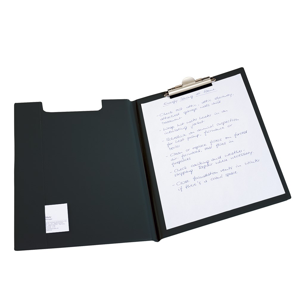 Mapa od pojačanog mekog polivinila s kvačicom. Na prednjoj unutarnjoj strani vertikalni džep za umetanje bilješki, poruka, posjetnica i slično.