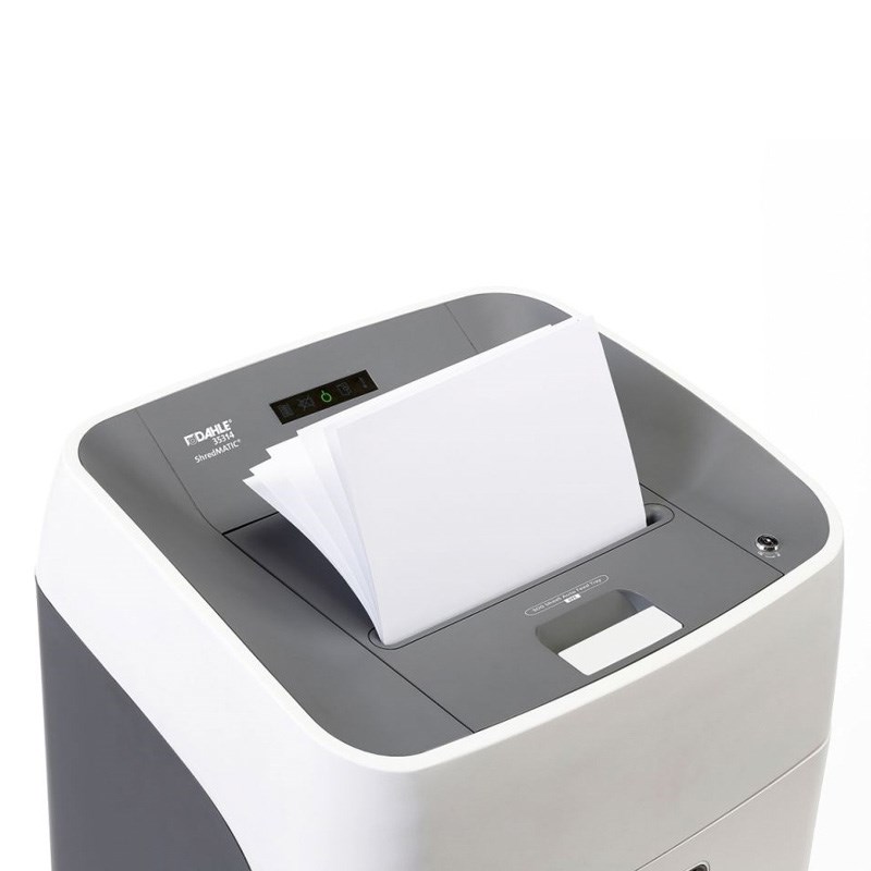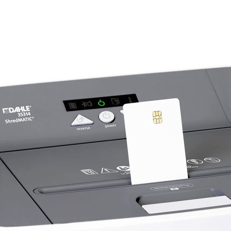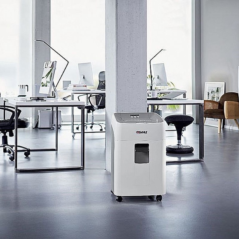 Uredski uništavač koji posjeduje snažan, posebno tih, motor za visoki kapacitet usitnjavanja. "Oilfree" (uništavanje dokumenata bez uljenja noževa) s automatskim dodavačem do 300 listova, na kotačićima, s izvlačenjem ladice za pražnjenje košare. papira u jednom prolazu ili 300 listova iz automatskog dodavača, rez 4 x 15mm, pri čemu u koš od 40 litara stane do 1200 listova A4.